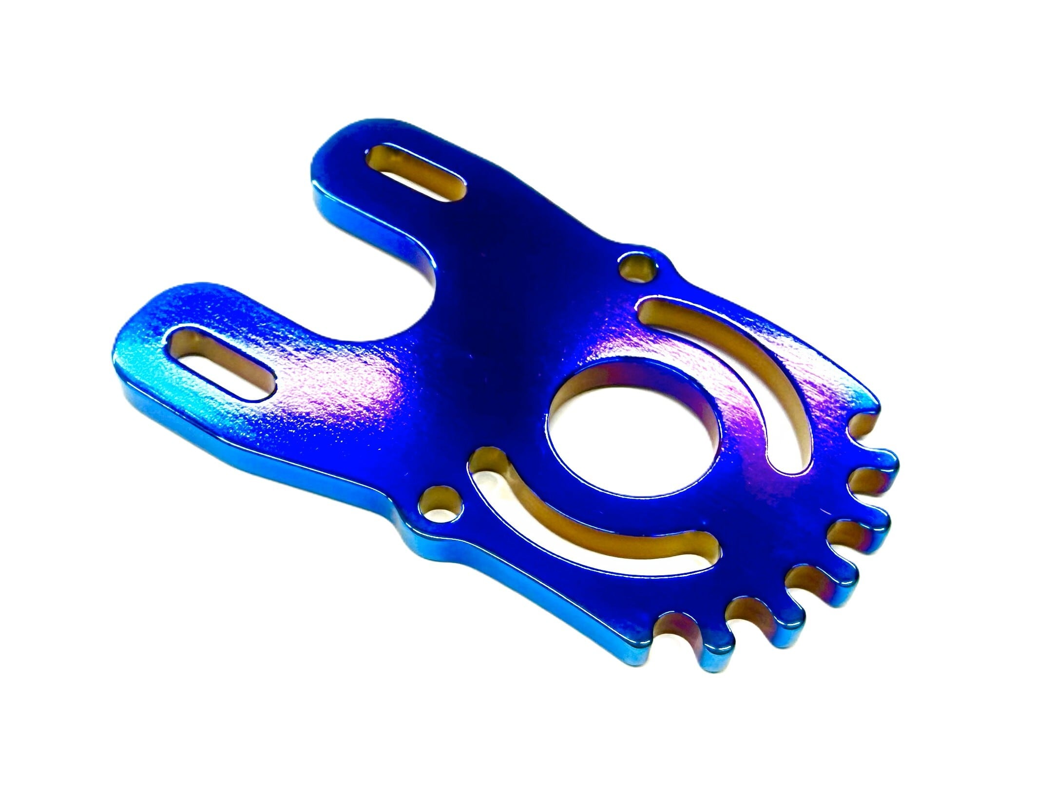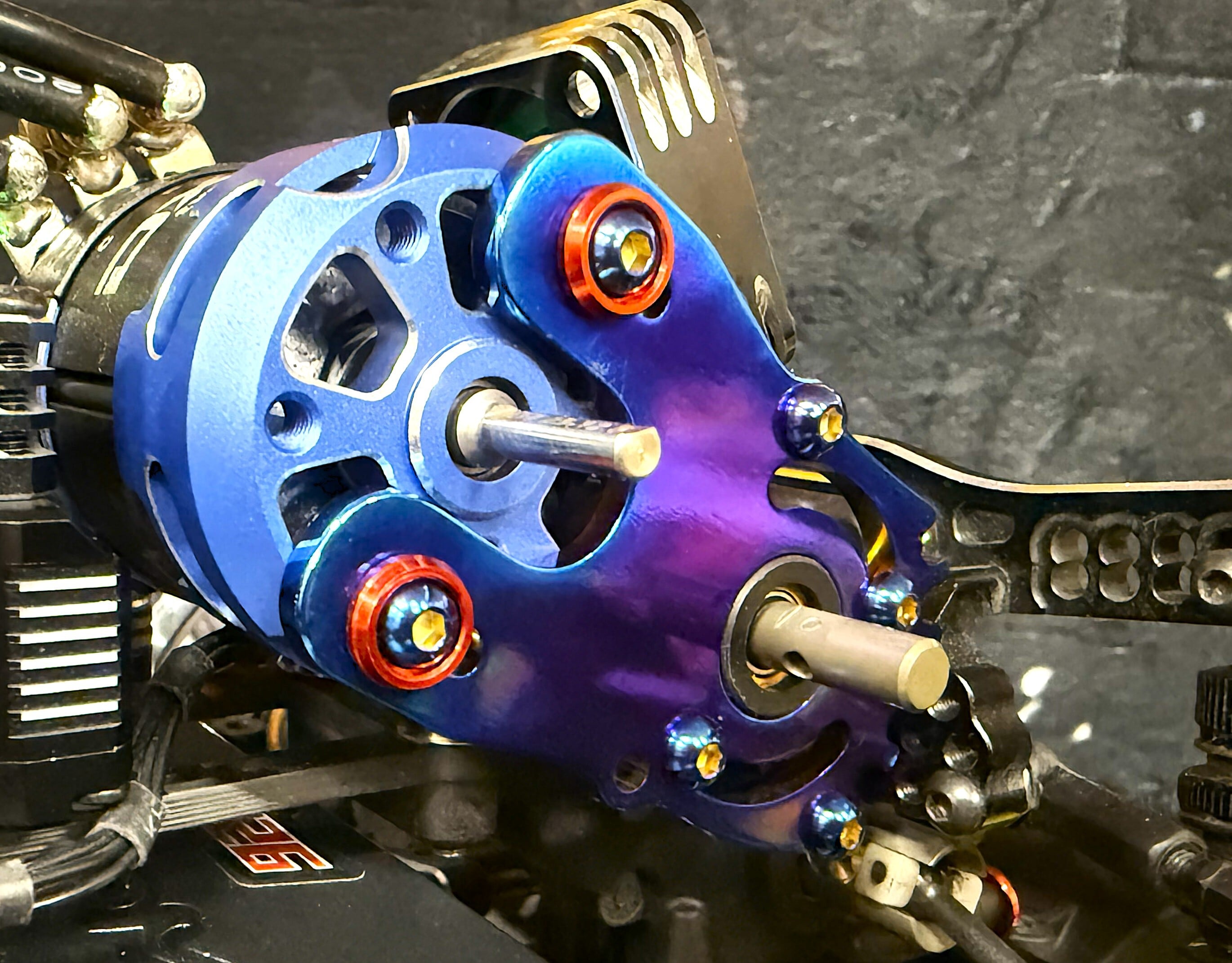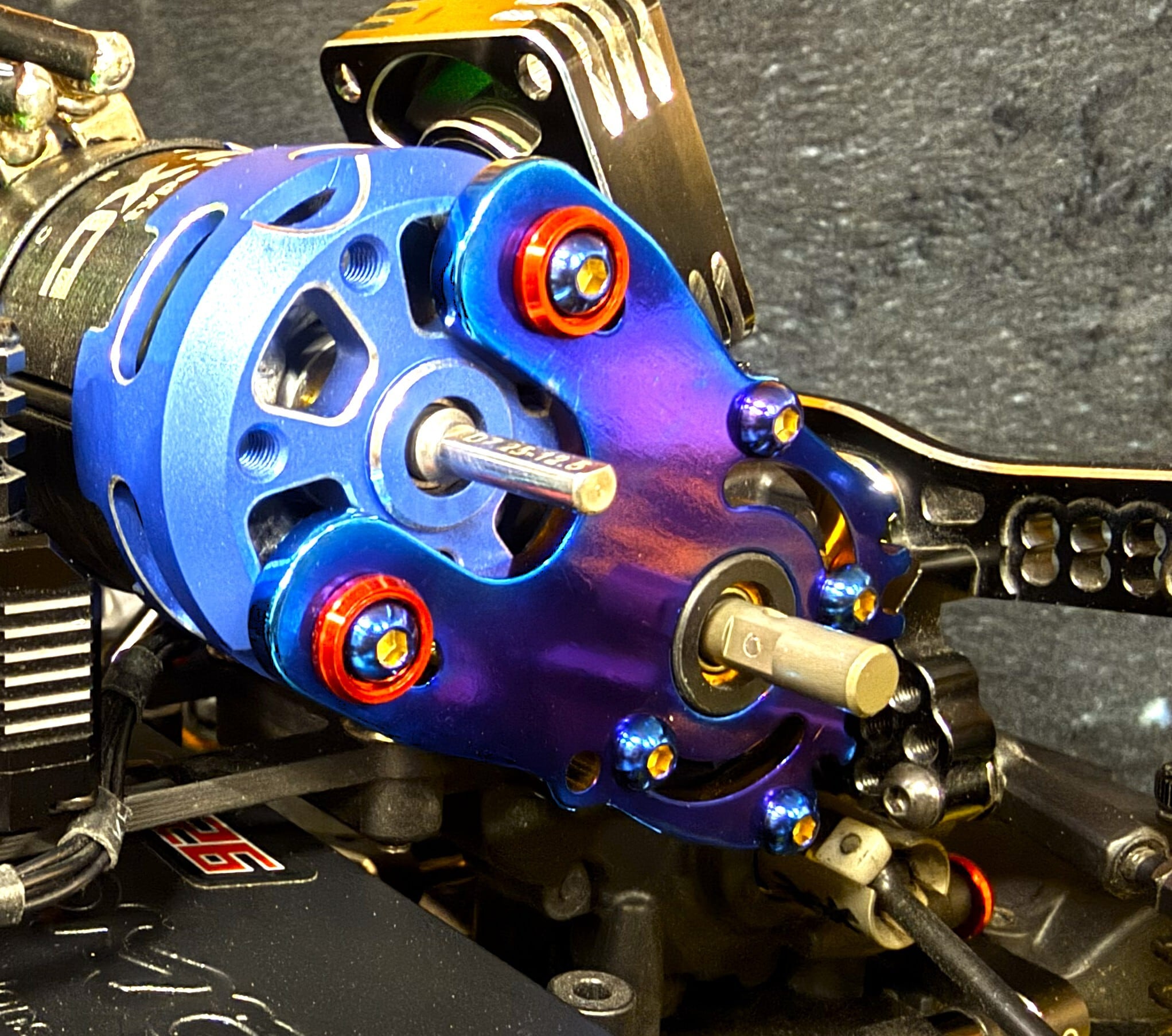 ■高強度な64チタンを高精度に加工されたモーターマウントを使用することで、極上なマシンメイクと艶めかしい発色の焼き色によるドレスアップ効果や個性あるマシン作りが可能になります。モーターマウント取付穴は標準と同じ穴位置になります。