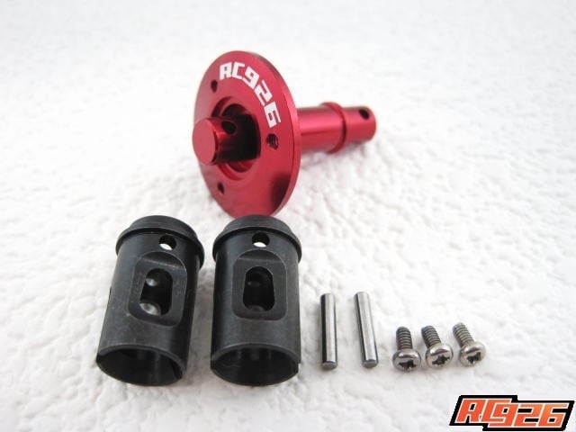 ■商品構成:アルミ製ソリッドアクスル×1、スチール製焼入れ強化タイプドライブカップ×2、アクスルピン×2、ナベタッピングビス2×5mm ×3