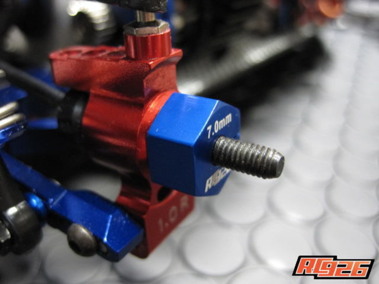 ※使用するシャーシのステアリングブロックやリアハブキャリア、ユニバーサルシャフトなどの組み合わせによって、アルミクランプ式ホイールハブを使用した場合にガタが出て気になる場合は、内径5mmの薄いシムなどを使用して、適度なガタ取りの調整を行ってください。